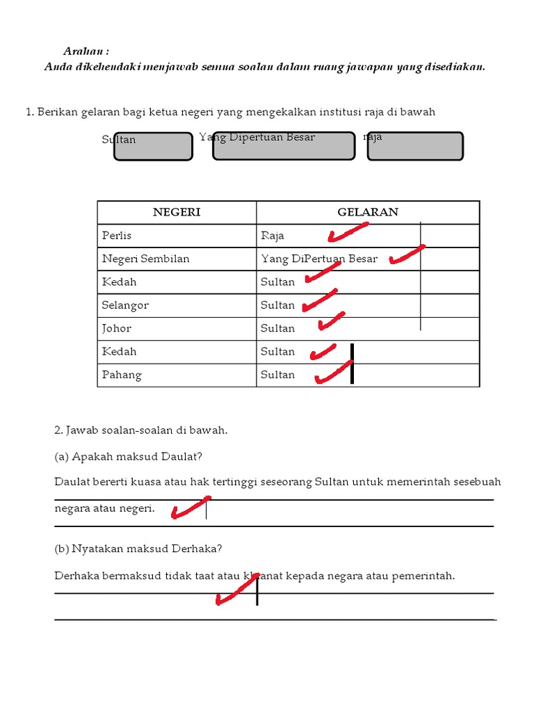 A 8 b 9 c 10 6 Gelaran ketua negeri bagi negeri Perlis ialah a Raja b Sultan c Yang di-Pertuan Besar 7 Plih gelaran ketua negeri yang tidak tepat a Johor - sultan b Sarawak - Yang di-Pertua Negeri c Wilayah Persekutuan - Raja 8 Gelaran Yang di-Pertua Negeri digunakan di negeri. Salah satunya ialah Malaysia yang merupakan sebuah negara berdaulat kerana mempunyai raja dan mengekalkan institusi raja. Ujian 1 sejarah tahun 5 was published by MyDocSHELVES Integrated Mobile Platform For Electronic Document Management on 2017-01-15.
