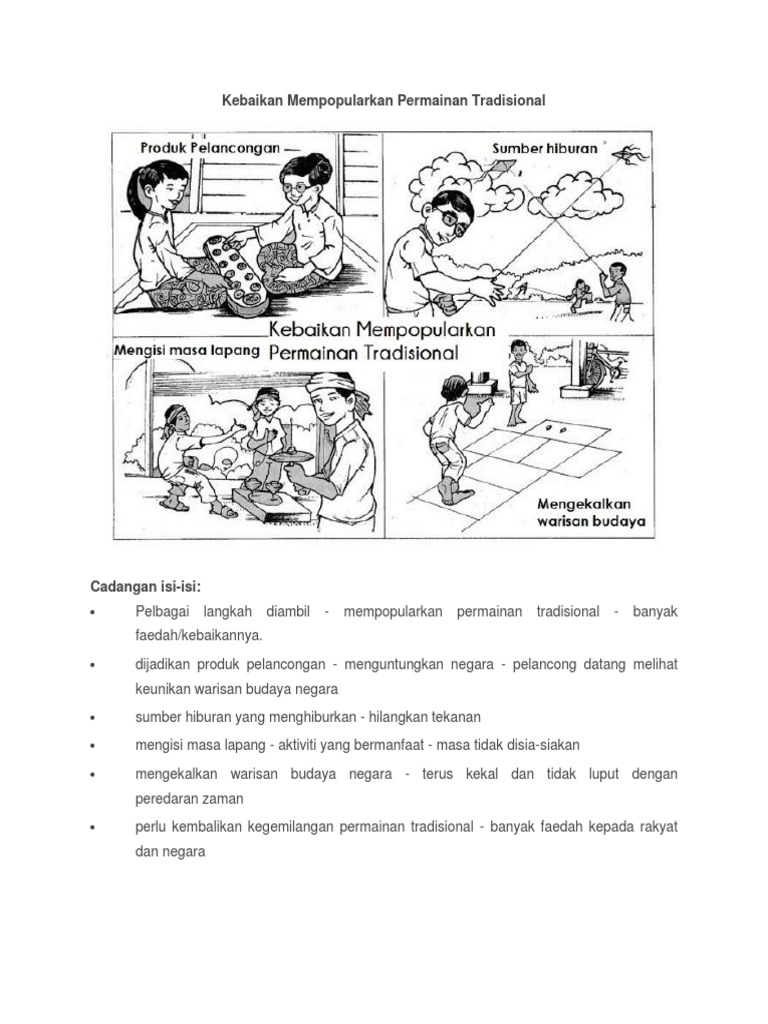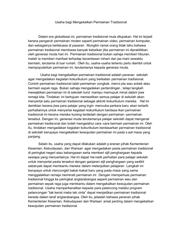 57837543 Usaha Bagi Mengekalkan Permainan Tradisional Pdf Document. Kepentingan Permainan Tradisional Permainan tradisional merupakan warisan budaya masyarakat Melayu yang tidak ternilai harganya. Contohnya permainan congkak gasing dan wau.