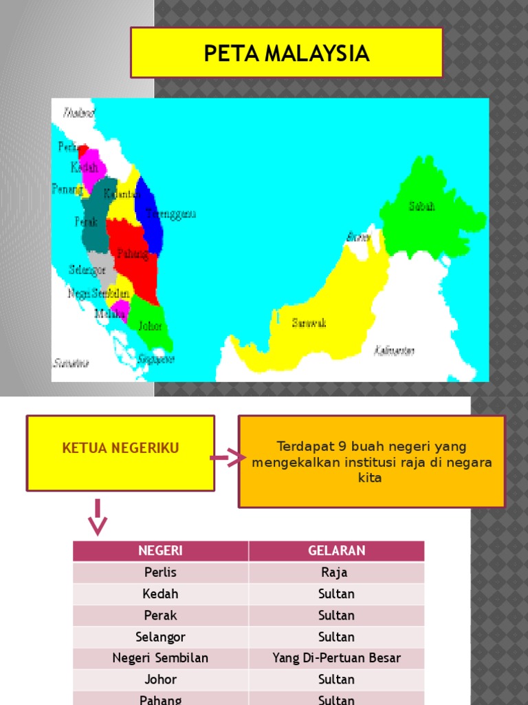 A 8 b 9 c 10 6 Gelaran ketua negeri bagi negeri Perlis ialah a Raja b Sultan c Yang di-Pertuan Besar 7 Plih gelaran ketua negeri yang tidak tepat a Johor - sultan b Sarawak - Yang di-Pertua Negeri c Wilayah Persekutuan - Raja 8 Gelaran Yang di-Pertua Negeri digunakan di negeri.