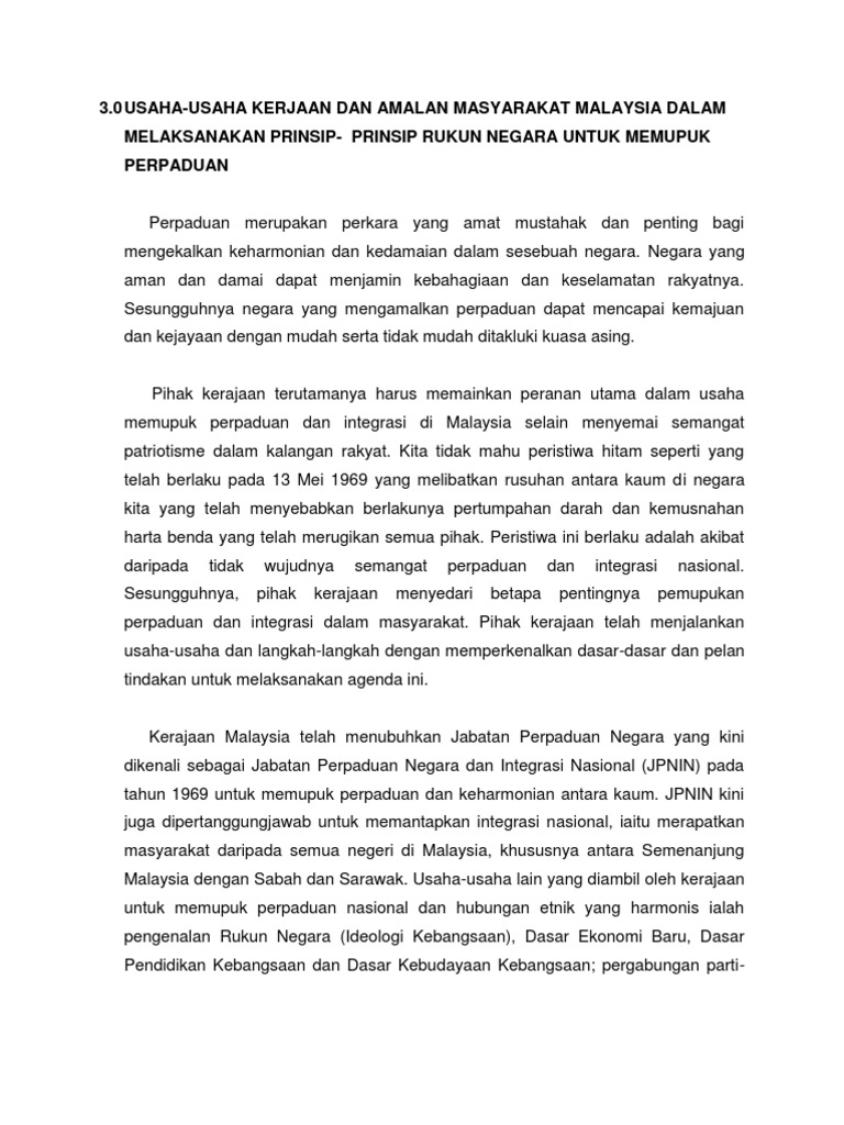 Usaha-usaha pelbagai pihak untuk mengekalkan perpaduan 1 Usaha kerajaan. Pendekatan yang bersikap keras akan mengeruhkan agenda pemupukan kesepaduan sosial yang mendorong suasana yang lebih tegang sehingga memudaratkan hubungan etnik di negara ini. Dengan adanya Rukun Negara ini masyarakat di Malaysia dapat mengikuti dan menghayati lima prinsip Rukun Negara demi memupuk semangat perpaduan antara kaum dan dapat mencapai konsep falsafah sejahtera.