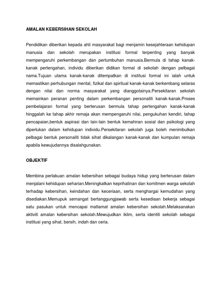 Seragam atau mengekalkan kebersihan tempat kerja pada tahap asal adalah penting agar segala usaha yang dilakukan dalam tiga aktiviti terdahulu tidak menjadi sia-sia. Dalam lingkungan keluarga ini anak berada dalam pengaruh kedua orangtuanya ayah dan ibunya serta saudara-saudaranya. 13 Sekolah saya merupakan sebuah institusi pendidikan yang boleh dibanggakan.
