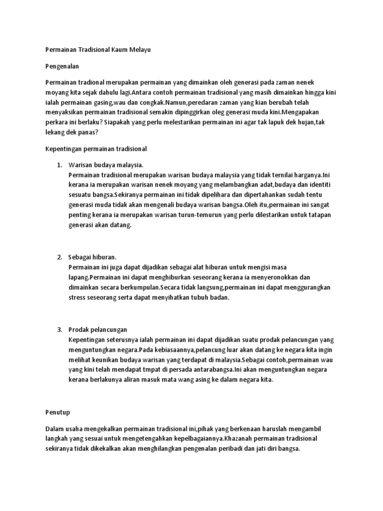 Request PDF On Apr 4 2019 Gustiana Mega Anggita published Eksistensi Permainan Tradisional sebagai Warisan Budaya Bangsa Find read and cite all the research you need on ResearchGate. 57837543 Usaha Bagi Mengekalkan Permainan Tradisional Pdf Document. Menyedari hakikat ini permainan tradisional yang merupakan permainan warisan masyarakat Melayu sejak zaman Kesultanan Melayu haruslah dihidupkan kembali kerana permainan tradisional ini menjadi lambang warisan dan kebudayaan masyarakat Melayu supaya tak lapuk dek hujan tak lekang dek panas.
