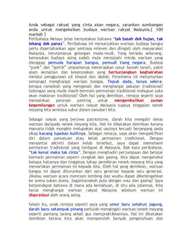 Peribahasa melayu jelas menyatakan bahawa tak basah dek hujan tak lekang dek panas. Ramalan spm 2 usaha mengekalkan budaya warisan rakyat malaysia arus globalisasi telah menyebabkan pelbagai budaya warisan rakyat malaysia. Anda sebagai rakyat yang cinta akan negara sarankan sumbangan anda untuk mengekalkan budaya warisan rakyat Malaysia 100 markah Peribahasa Melayu jelas menyatakan bahawa tak basah dek hujan tak lekang dek panas.