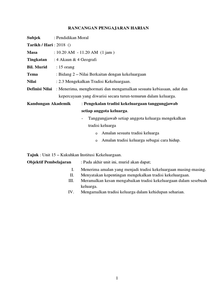 HelloJom kita belajarMsSyikin di siniPendidikan Moral Tingkatan 3unit 4AMALAN TRADISI KEKELUARGAAN KHAZANAH KITAMengekalkanAmalanTradisiKekeluargaan Dalam Sesuatu. Contoh RPH pendidikan moral 7 RANCANGAN PENGAJARAN HARIAN Tingkatan. Kemanusiaan Asas Kemoralan 210 GLOSARI 227 SENARAI RUJUKAN 229 INDEKS 231 iv PENDAHULUAN Buku teks Pendidikan Moral Tingkatan 3 ini ditulis berdasarkan Dokumen Standard Kurikulum dan Pentaksiran DSKP Pendidikan Moral Tingkatan 3 Kurikulum Standard Sekolah Menengah KSSM.